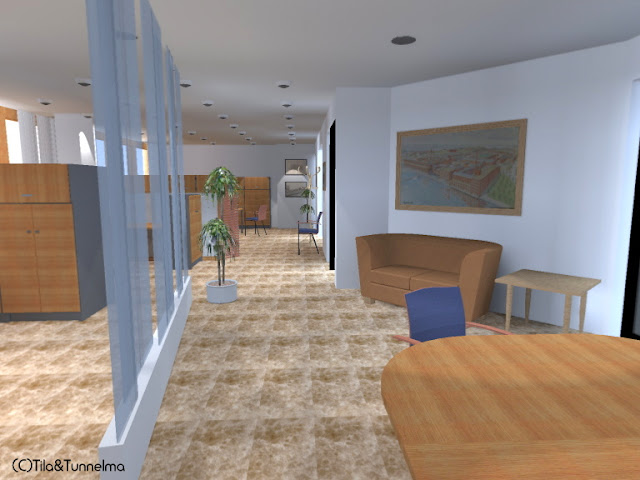 Mukana muuttivat kaikki vanhat, hyväkuntoiset kalusteet. Tilojen neliömäärä kasvoi noin 70:stä 100:aan, mutta uusi tila oli haastava muotonsa, ikkunoiden ja pylväiden takia. Keskellä kapeaa tilaa on lasiseinä tilanjakajana, ja ikkunoita on myös käytäväseinällä. Minun osuuteni muutossa olikin tilankäytön ja uuden kalustejärjestyksen suunnittelu niin, että kaikilla 3 työntekijällä säilyy oma työpöytä ja kaapistot. Tilaa tarvittiin myös neuvottelupöydälle, yhteiselle kopiokoneelle ja sen oheistarvikkeille, arkistokaapeille, vaatesäilytykselle sekä asiakkaiden odotustilalle ja naulakolle.