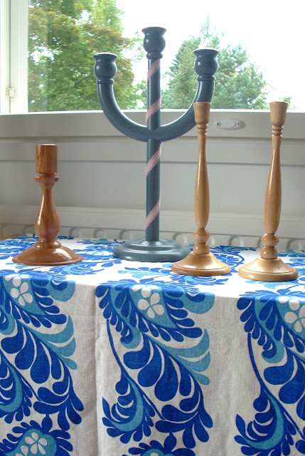 Sunnuntaina olikin sitten aikaa kierrellä kaupungilla. Tampereella oli silloin kaksi mukavaa tapahtumaa: Aamulehden peräkonttikirppis Keskustorilla ja Designtori Ojakadulla. Väkeä oli paljon liikkeellä, vaikka aamulla vielä ripsi vettä. Muutaman löydön tein kirppikseltä syksyn pimeitä iltoja ajatellen, eli puisia kynttilänjalkoja ja kauniin kankaan, kaikki yhteensä alle 10,-. Kyntteliköstä lähti jo somistenauha pois, ja seuraavaksi se saa spraymaalia pintaansa. Puunvärisiä en taida raskia maalata... Kankaan kohtalosta ei ole vielä tietoa, mutta eiköhän sekin paikkansa löydä.